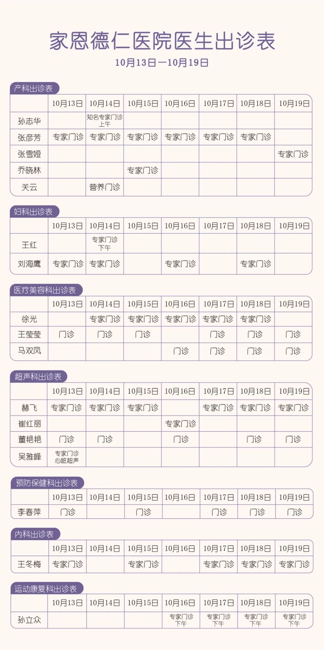 医生出诊 | 10月13日—10月19日家恩德仁医院各科室医生出诊