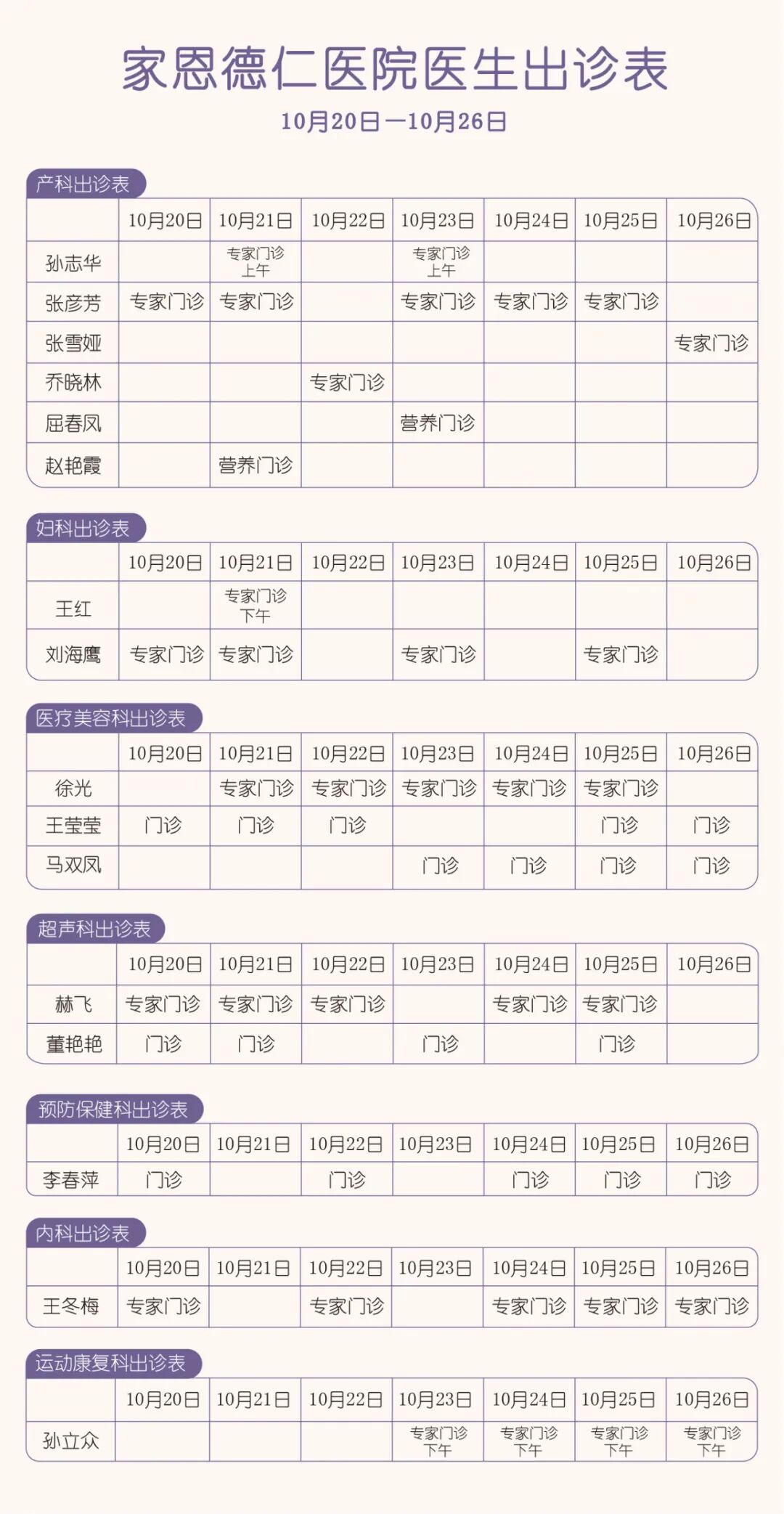 医生出诊 | 10月20日—10月26日家恩德仁医院各科室医生出诊