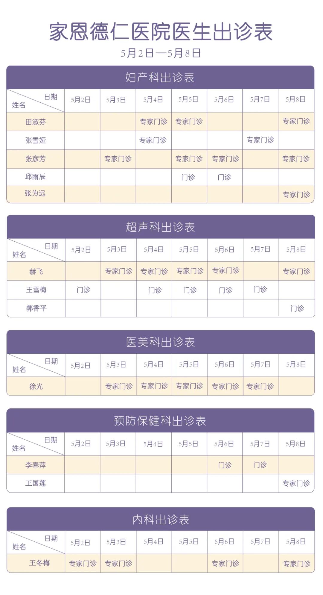 8月2日—8月8日家恩德仁各科室医生出诊表