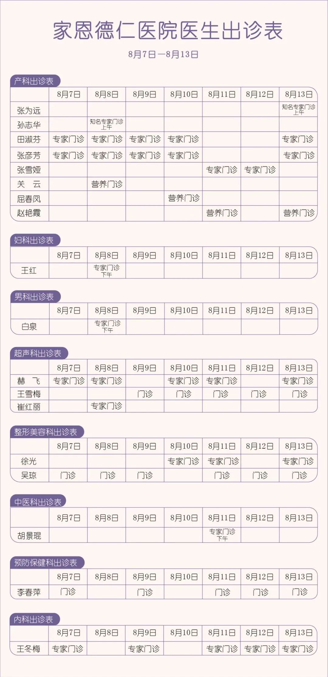 8月9日—8月15日家恩德仁各科室医生出诊表