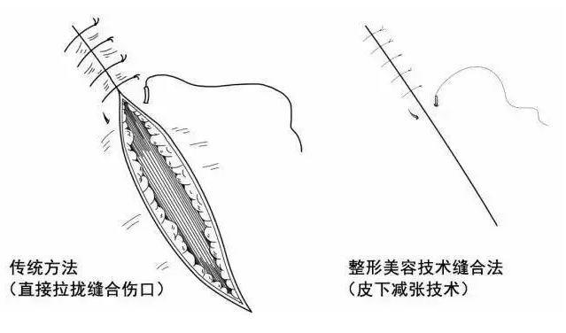 传统的缝合方式----将皮肤直接全层拉拢缝合,伤口张力较大;皮肤对合度较差,术后瘢痕增生明显,基本无法达到美观的需求。